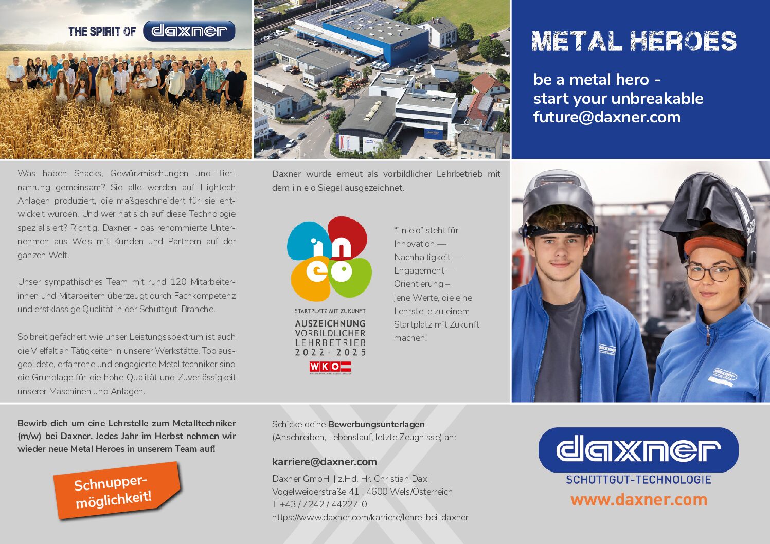 Bewirb dich um eine Lehrstelle zum Metalltechniker bei Daxner – wir nehmen jedes Jahr neue Metal Heroes in unserem Team auf!