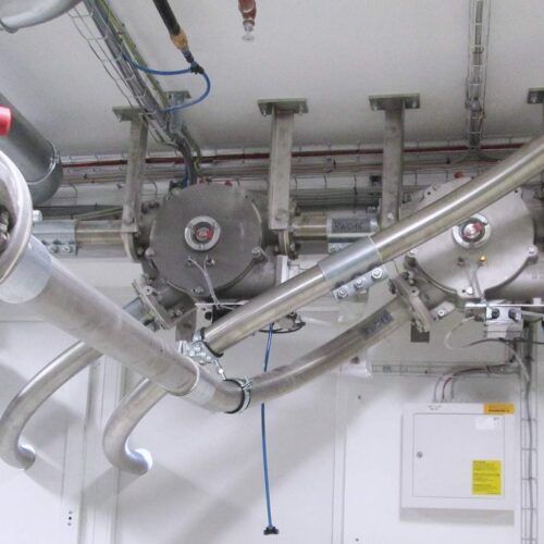 A typical diverter valve rotates a pipe actuated by a pneumatic cylinder. This diverter pipe directs the material flow within the pipline network. Special design emphasis was placed on minimizing the particle degradation and pressure loss, achieving a good sealing and a quiet and smooth operation.
