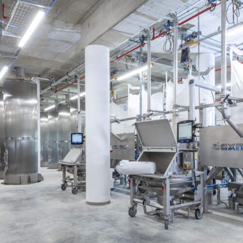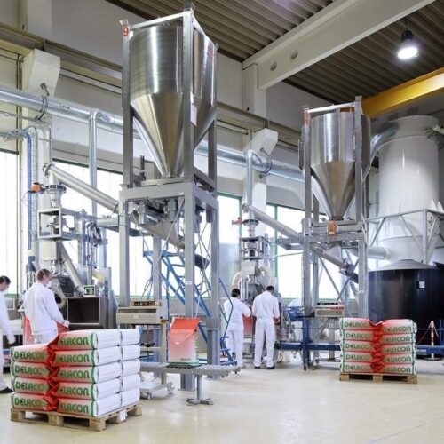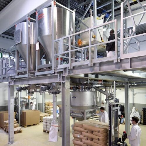 Hand components: a bag intake station combined with a Big bag discharge station adds the pre-commissioned hand components to the production flow. The on-site batch mixers were integrated into the new production facility.