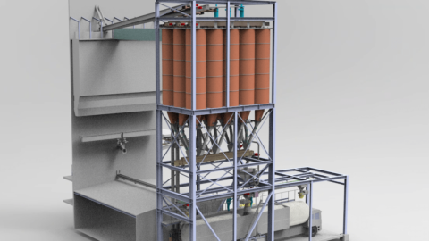 Components handling: large components are stored in outdoor silos, medium components in Big bags. A dust-free Big bag connection system is responsible for the discharge of the ingredients. A docking system fills the finished blend into a container.