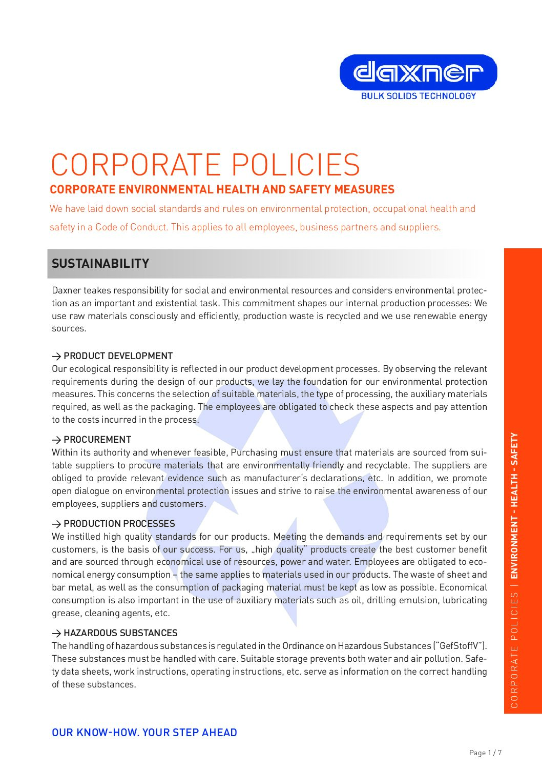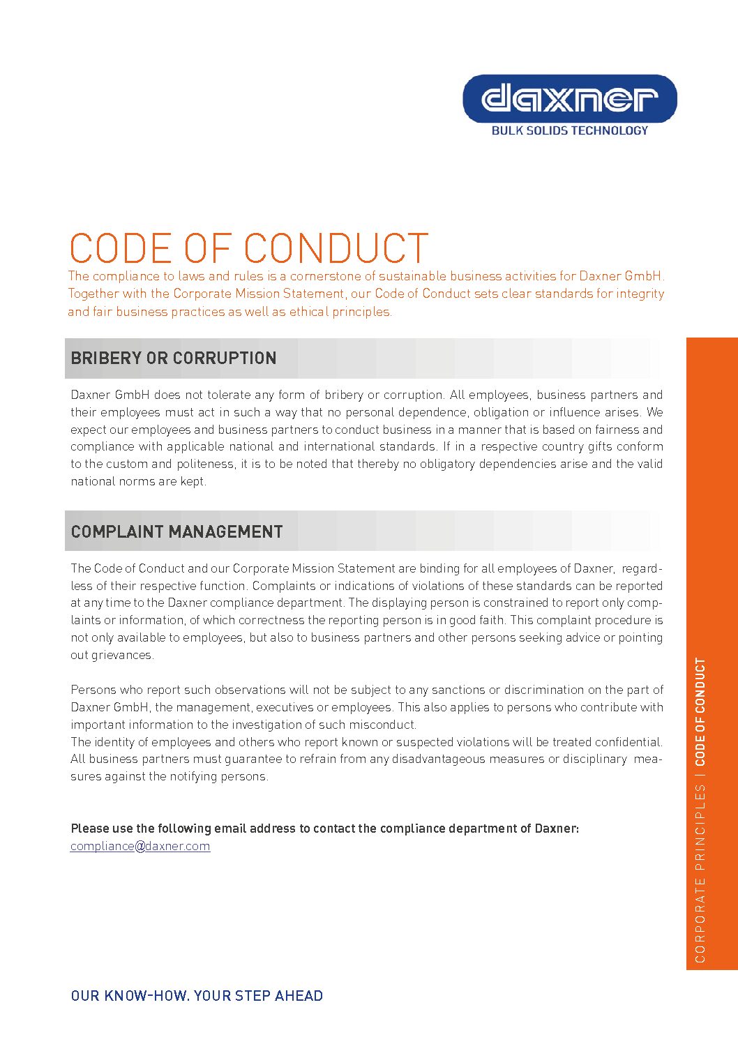 Compliance with legal regulations and internal guidelines has top priority for Daxner and is a cornerstone of sustainable business activity. Together with the Corporate Mission Statement, our Code of Conduct sets clear standards of integrity and fair business practices as well as ethical principles. Daxner takes Responsibility for social and environmental resources and pledges to the ETI-Codex.