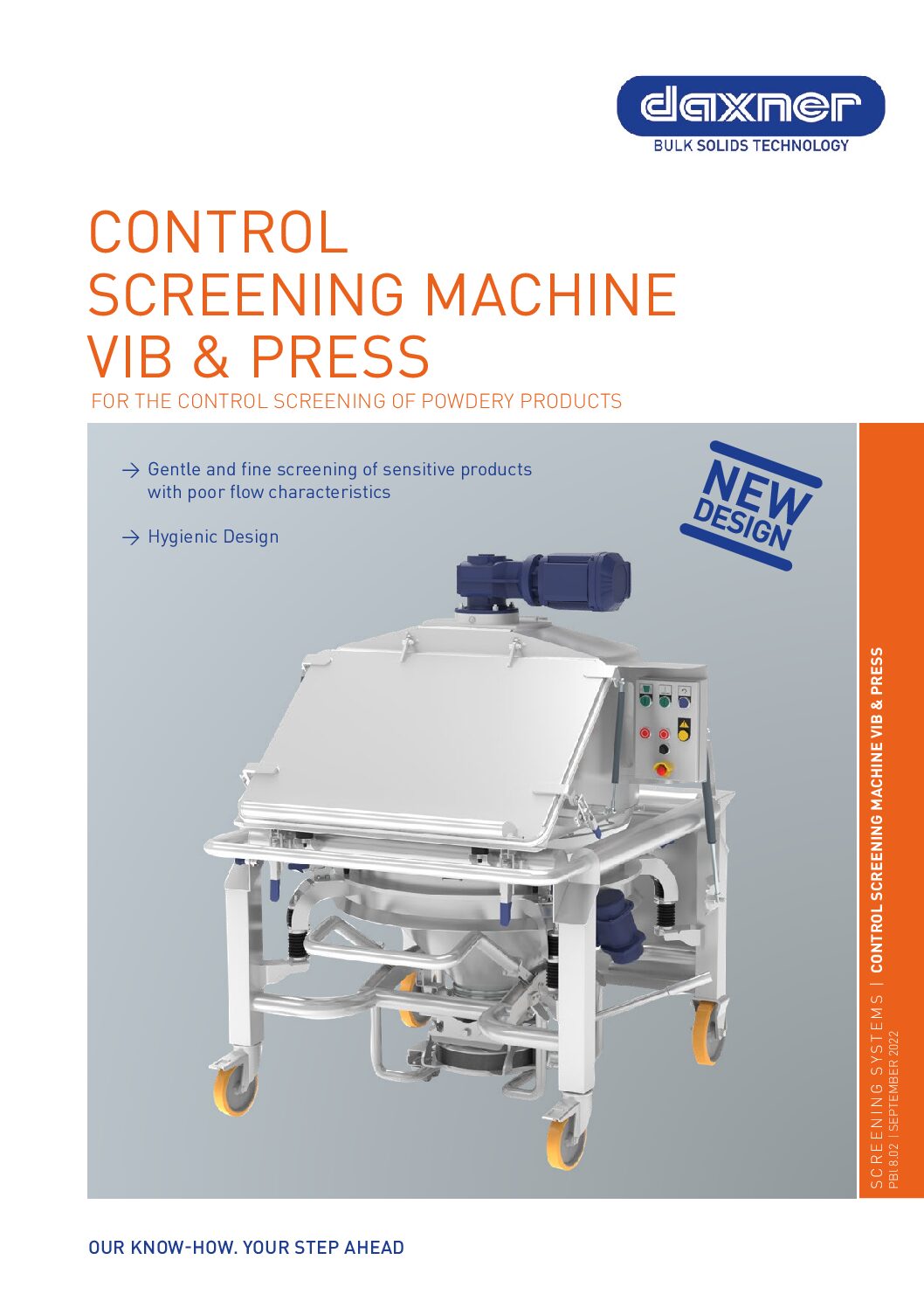 VIB & PRESS is an innovation from Daxner. Two actions are performed at once: Additional to the vibrating screen (VIB) which performs the screening action, the products are pressed through the flat screen (PRESS) using the variable speed. Paddles are positioned just above the screen mesh. Agglomerations and lumps in the product are broken down back to their original particle size. The vibration keeps the screen free of residue and cleans it at the same time.