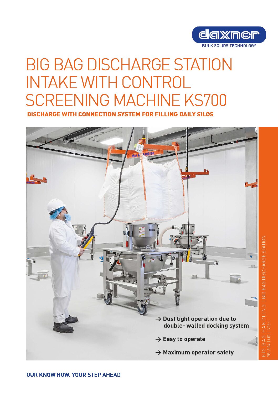 Big bags are positioned on the docking station with a hoist. The manually or pneumatically activated docking mechanism enables a safe and dust-free Big bag discharge.