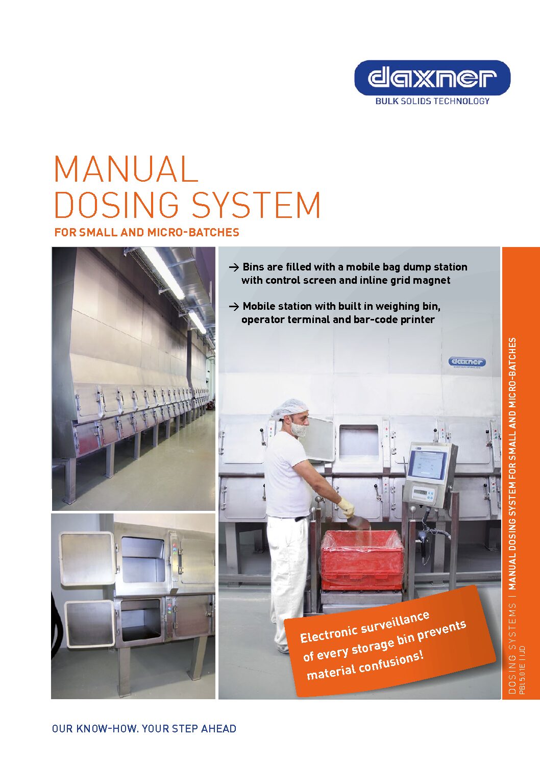The micro batch dosing system consists of a mobile station with a built in weighing bin, operator terminal and bar-code printer. The dosing happens manually and operator guided.