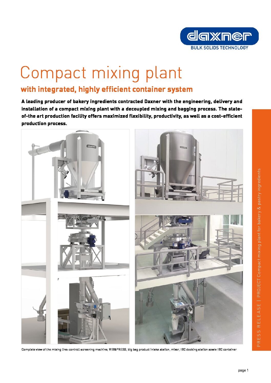 A leading producer of bakery ingredients contracted Daxner with the engineering, delivery and installation of a compact mixing plant with a decoupled mixing and bagging process. The state-of-the art production facility offers maximized flexibility, productivity, as well as a cost-efficient production process.