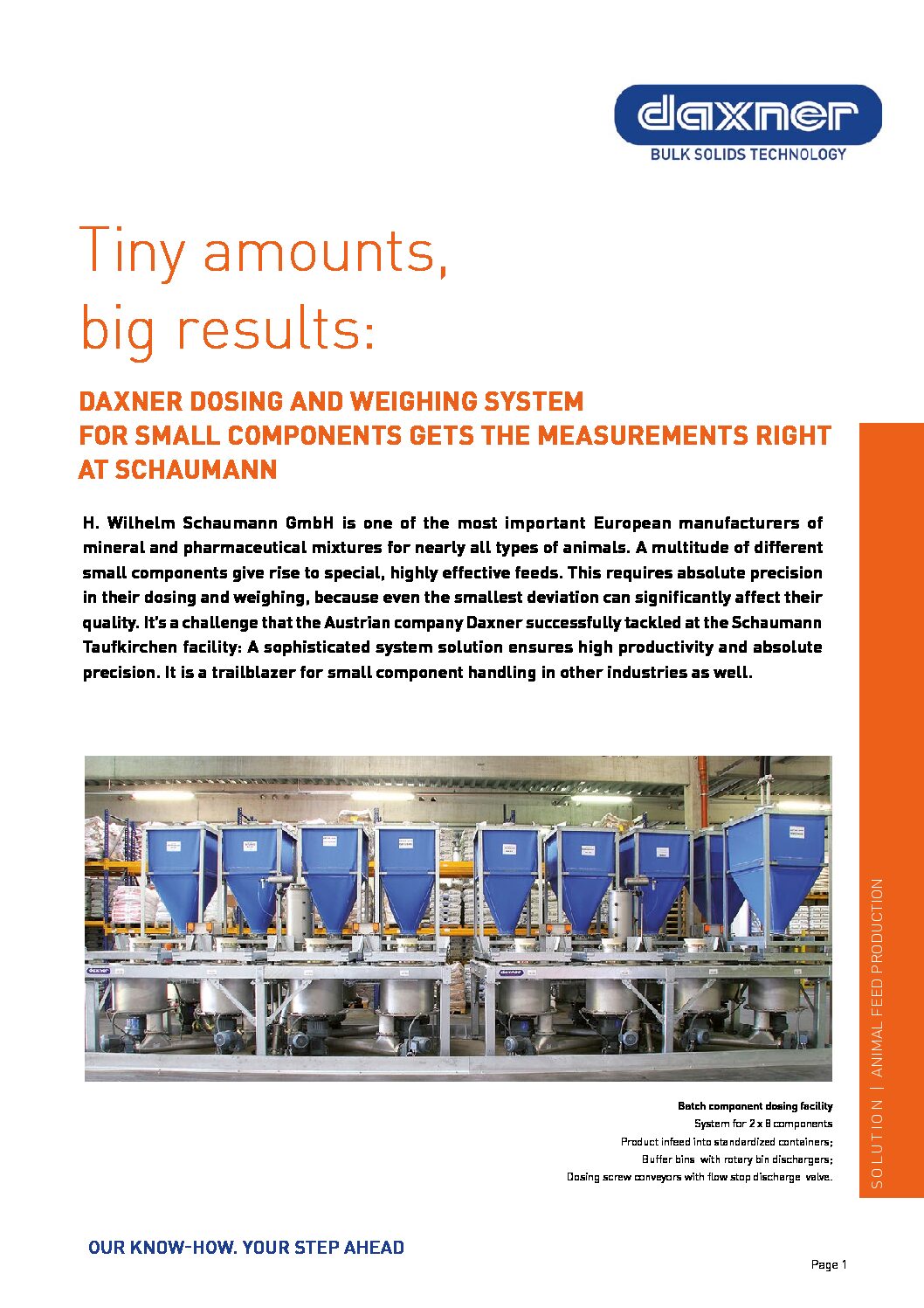 The company is one of the most important European manufacturers of mineral and active ingredients for nearly all types of animals. A multitude of different small components give rise to special, highly effective feeds. This requires absolute precision in their dosing and weighing, because even the smallest deviation can significantly affect their quality. The accuracy of the automatic dosing and weighing system developed by Daxner is 10 grams per component.