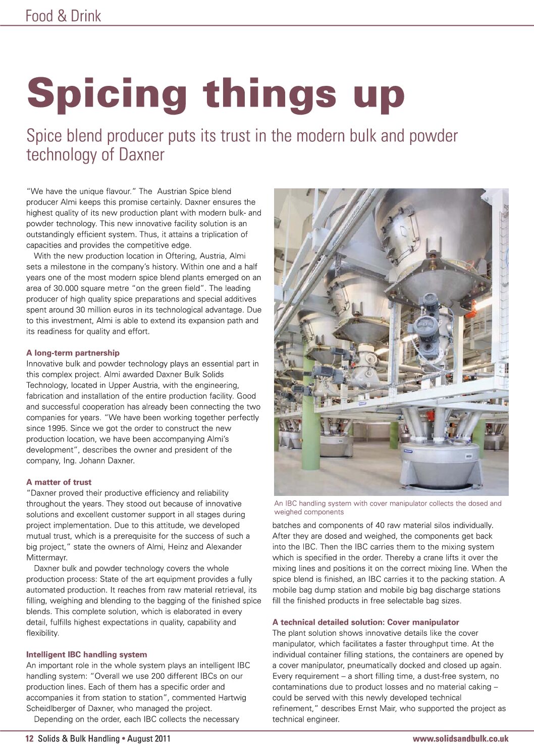 Thereby a crane lifts the IBC over the mixing lines and positions it on the correct mixing line, then the IBC is docked and discharged without any residues by a container discharge system. According to the size of the batches and recipes the mixing lines distinguish themselves in terms of the blender size and the implemented mixing system, in order to ensure utmost mixing accuracy, mixing capacity and gentle product handling. When the spice blend is finished, an IBC carries it to the packing station. A mobile bag dump station and mobile big bag discharge stations fill the finished products in free selectable bag sizes.