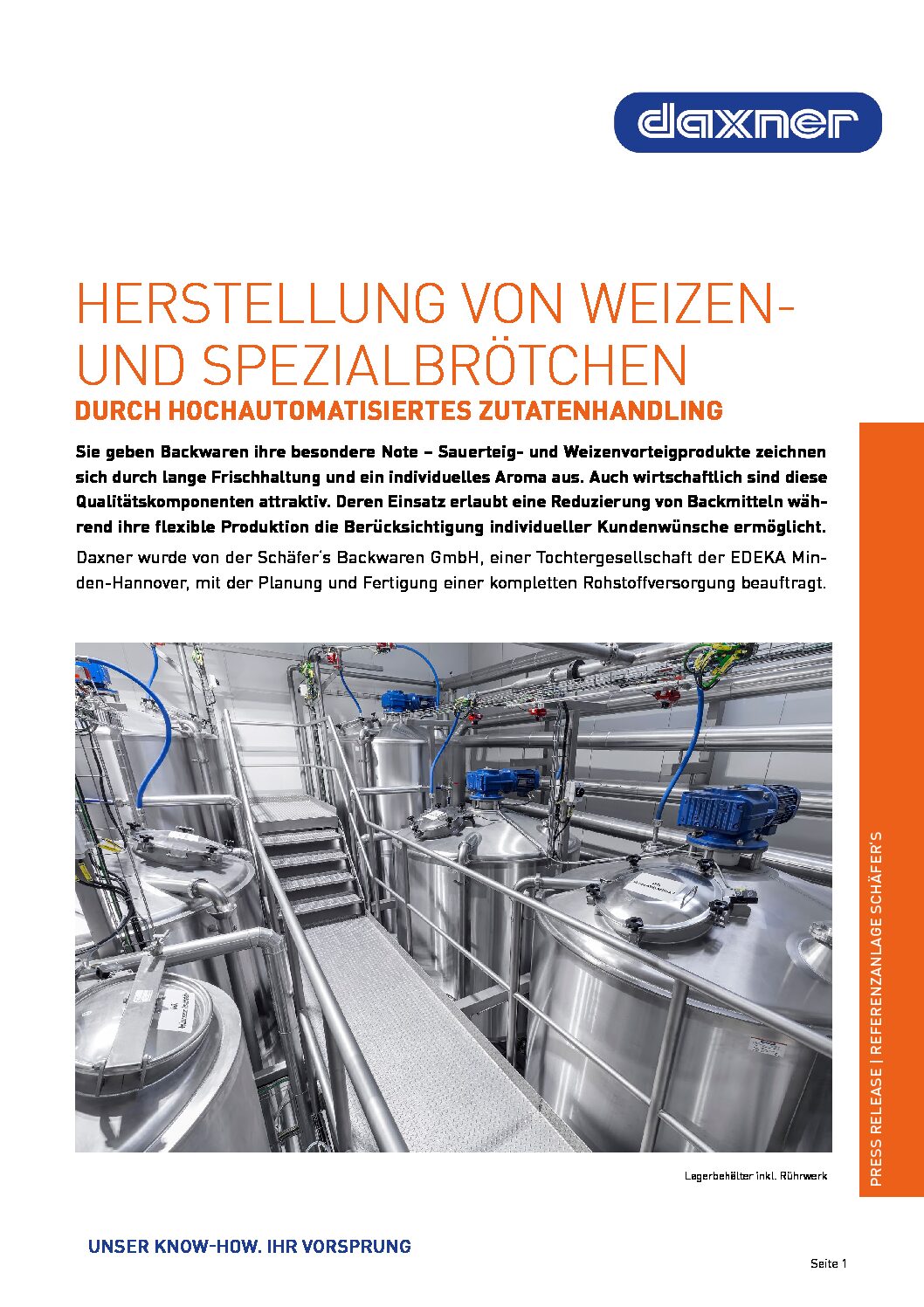 Daxner wurde von der Schäfer‘s Backwaren GmbH, einer Tochtergesellschaft der EDEKA Minden-Hannover, mit der Planung und Fertigung einer kompletten Rohstoffversorgung beauftragt.