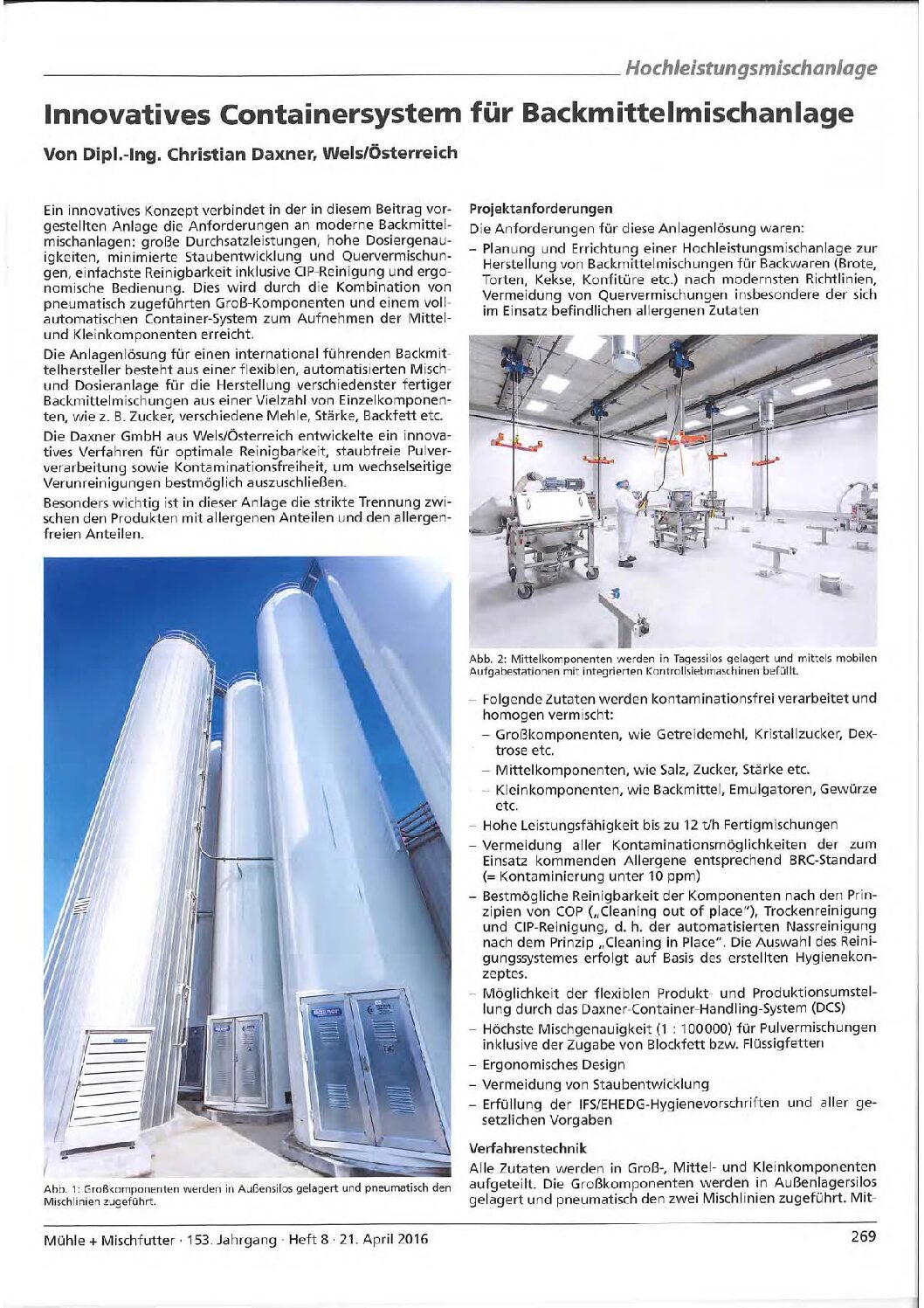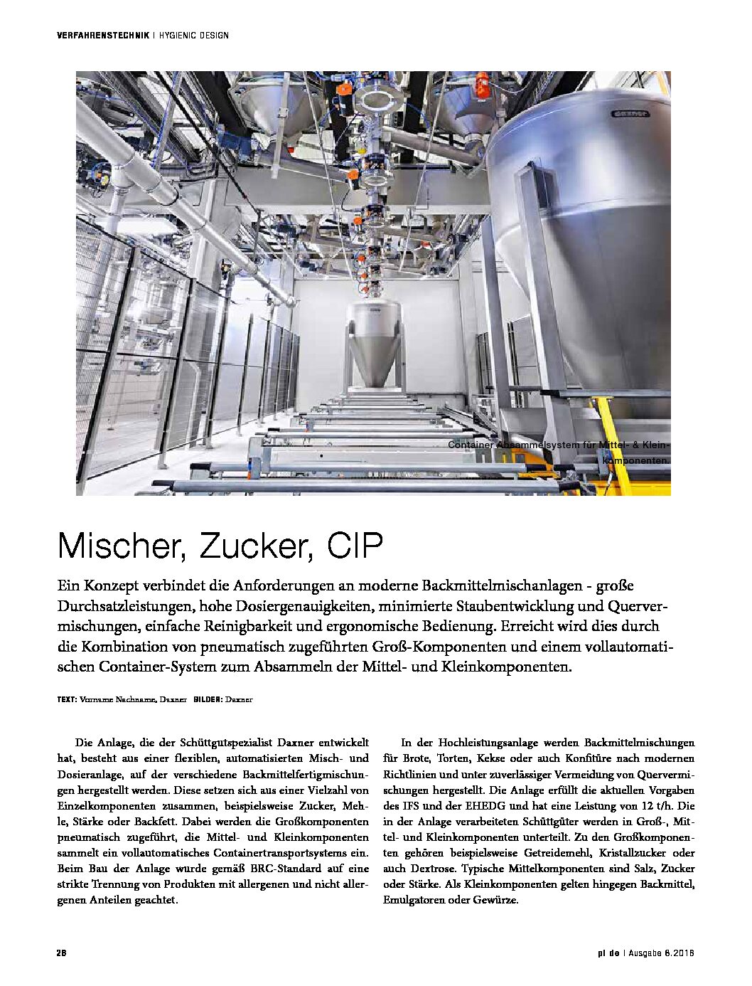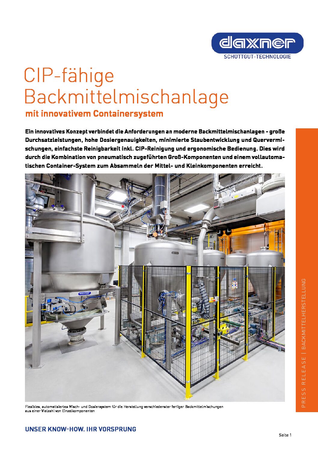 Ein innovatives Konzept verbindet die Anforderungen an moderne Backmittelmischanlagen – große Durchsatzleistungen, hohe Dosiergenauigkeiten, minimierte Staubentwicklung und Quervermischungen, einfachste Reinigbarkeit inkl. CIP-Reinigung und ergonomische Bedienung. Dies wird durch die Kombination von pneumatisch zugeführten Groß-Komponenten und einem vollautomatischen Container-System zum Absammeln der Mittel- und Kleinkomponenten erreicht.