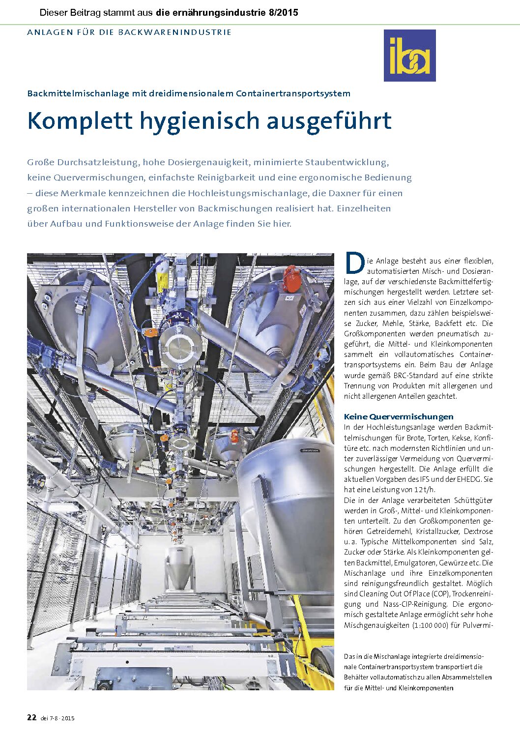 Die Anlage besteht aus einer flexiblen, automatisierten Misch- und Dosieranlage, auf der verschiedenste Backmittelfertigmischungen hergestellt werden. Diese setzen sich aus einer Vielzahl von Einzelkomponenten zusammen, beispielsweise Zucker, Mehle, Stärke, Backfett etc. Die Großkomponenten werden pneumatisch zugeführt, die Mittel- und Kleinkomponenten sammelt ein vollautomatisches Containertransportsystems ein. Beim Bau der Anlage wurde gemäß BRC-Standard auf eine strikte Trennung von Produkten mit allergenen und nicht allergenen Anteilen geachtet.