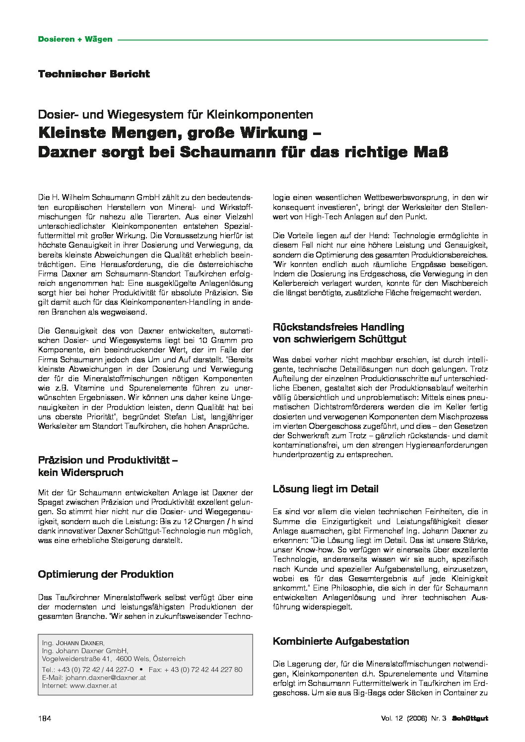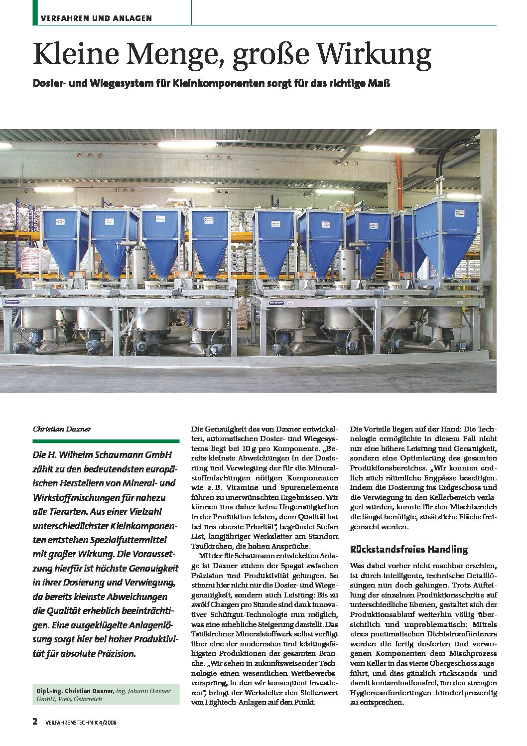 Das Unternehmen zählt zu den bedeutendsten europäischen Herstellern von Mineral- und Wirkstoffmischungen für nahezu alle Tierarten. Aus einer Vielzahl unterschiedlichster Kleinkomponenten entstehen Spezialfuttermittel mit großer Wirkung. Voraussetzung hierfür ist höchste Genauigkeit in ihrer Dosierung und Verwiegung, da bereits kleinste Abweichungen die Qualität erheblich beeinträchtigen. Die Genauigkeit des von Daxner entwickelten, automatischen Dosier- und Wiegesystems liegt bei 10 Gramm pro Komponente.