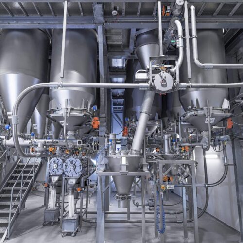 Die Verwiegung der Rezeptkomponenten erfolgt unterhalb der jeweiligen Silos in kleinen Wiegestationen. Zur Gewährleistung gleichbleibender Produktqualität erfolgt auf der jeweiligen Linie eine Kontrollverwiegung.