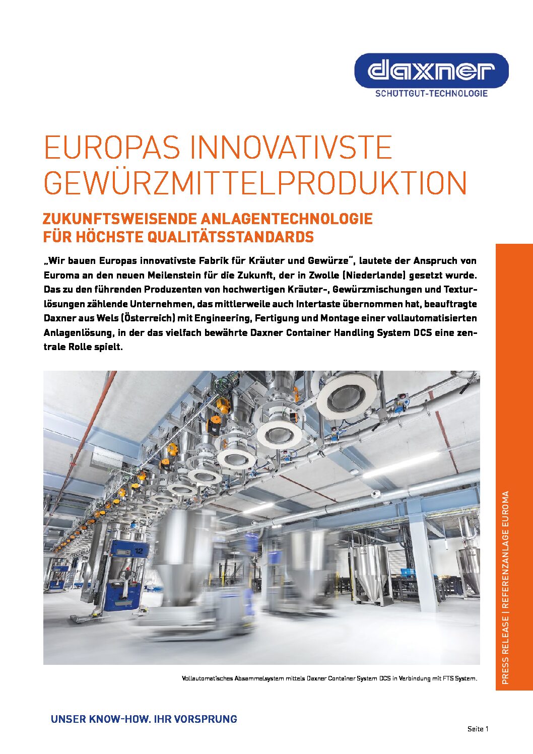 Das zu den führenden Produzenten von hochwertigen Kräuter-, Gewürzmischungen und Texturlösungen zählende Unternehmen beauftragte Daxner aus Wels (Österreich) mit Engineering, Fertigung und Montage einer vollautomatisierten Anlagenlösung, in der das vielfach bewährte Daxner Container Handling System DCS eine zentrale Rolle spielt.