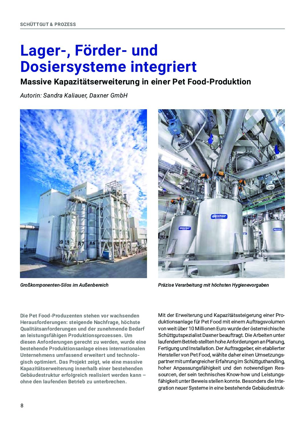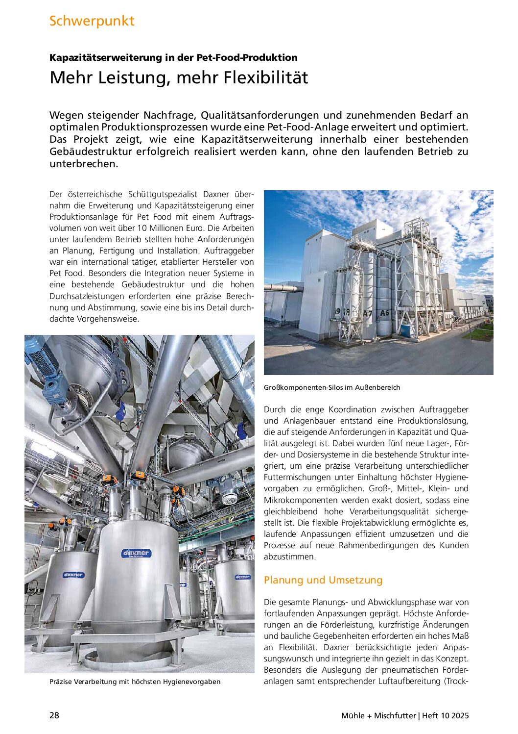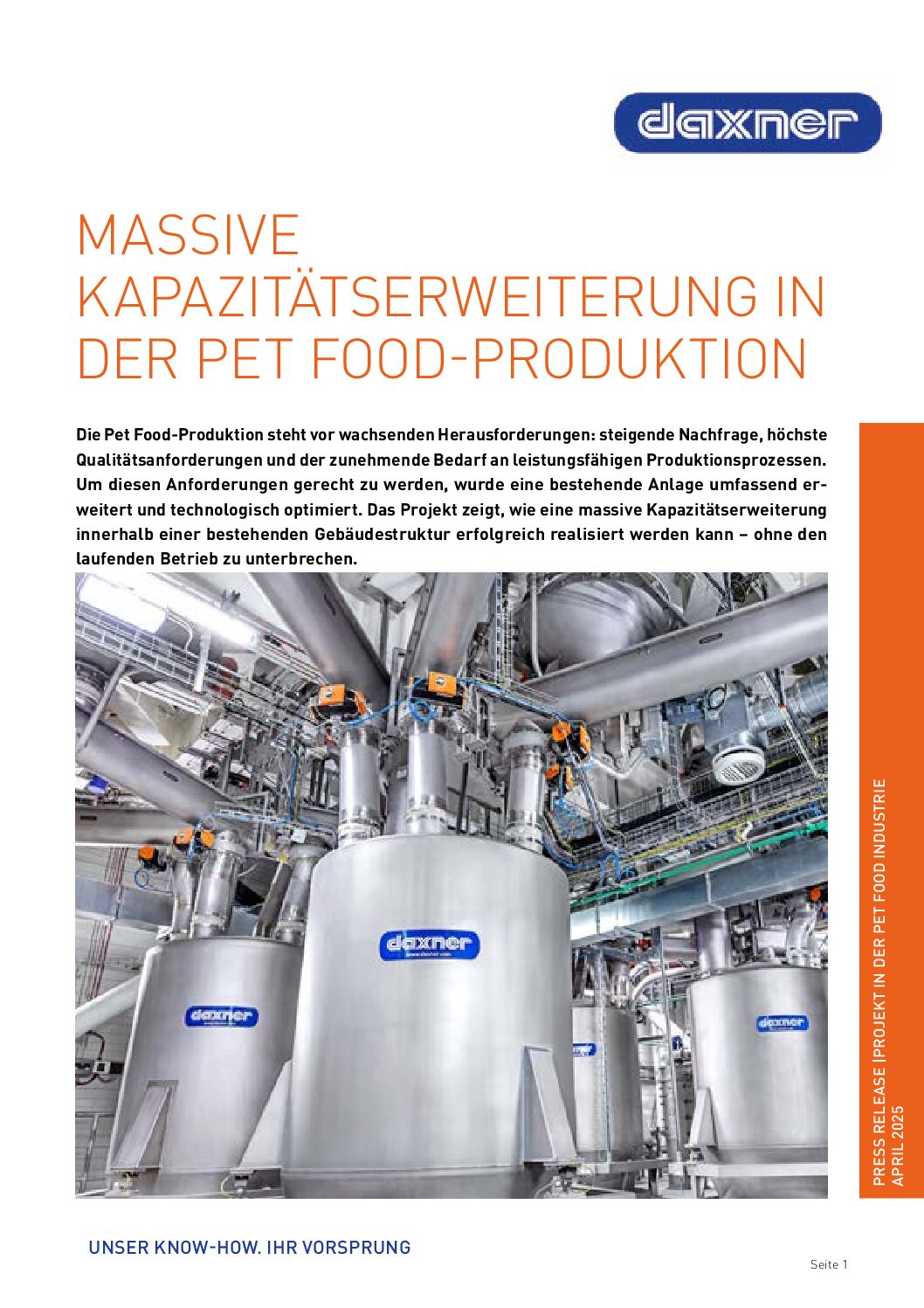 Mit der Erweiterung und Kapazitätssteigerung einer Produktionsanlage für Pet Food mit einem Auftragsvolumen von weit über 10 Millionen Euro konnte der österreichische Schüttgutspezialist Daxner sein technisches Know-how und Leistungsfähigkeit unter Beweis stellen. Die Arbeiten unter laufendem Betrieb stellten hohe Anforderungen an Planung, Fertigung und Installation. Der international tätige Auftraggeber, ein etablierter Hersteller von Pet Food, wählte daher einen Umsetzungspartner mit umfangreicher Erfahrung im Schüttguthandling, hoher Anpassungsfähigkeit und den notwendigen Ressourcen. Besonders die Integration neuer Systeme in eine bestehende Gebäudestruktur und die hohen Durchsatzleistungen erforderten eine präzise Berechnung und Abstimmung, sowie eine bis ins kleinste Detail durchdachte Vorgehensweise.