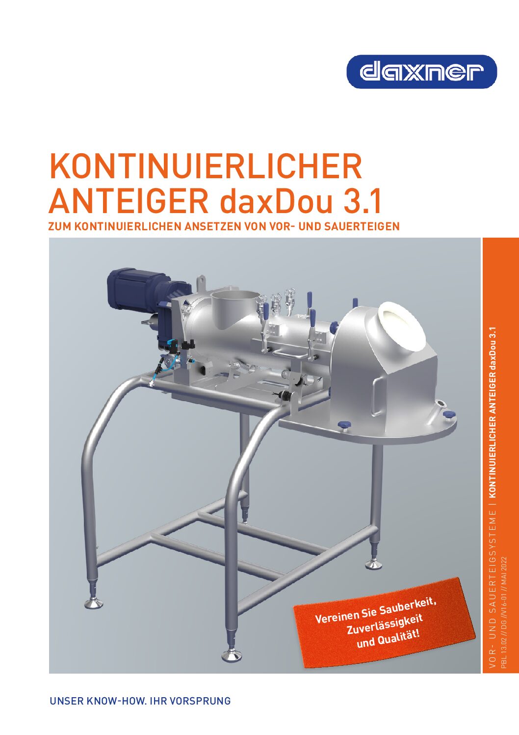 Der Anteiger daxDou 3.1 wird für die schonende Vermischung von Mehl, Wasser und Zusatzkomponenten eingesetzt. Er ist nach dem Prinzip eines Durchlaufmischers konzipiert und besitzt spezielle konstruktive Merkmale für die Teigherstellung. Dadurch können unterschiedliche Teigarten (Roggensauer, Weizensauer, Weizenvorteig o.ä.) mit diversen Teigausbeuten hergestellt werden.