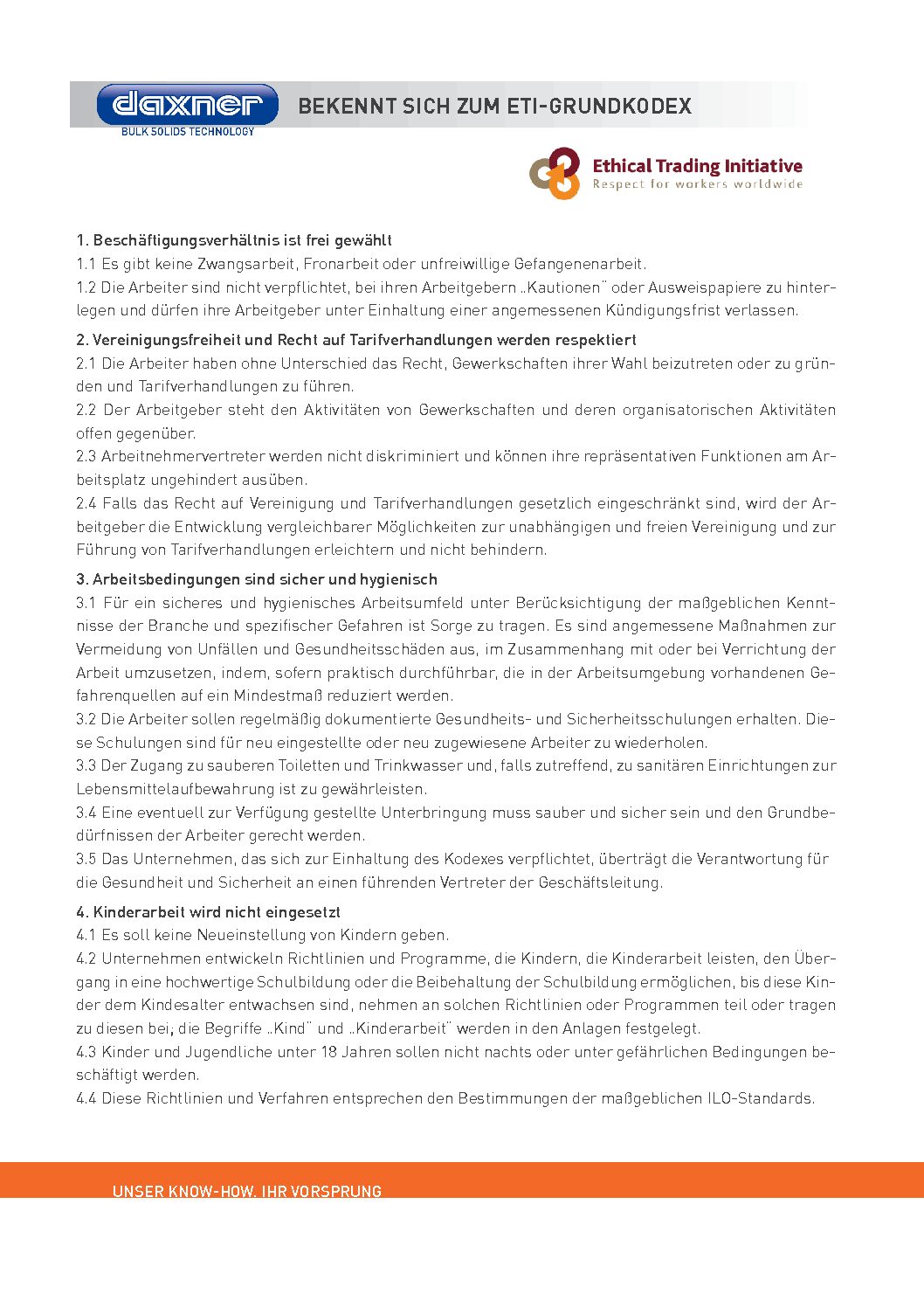 Seit 2015 wird Daxner laufend durch das Sedex Members Ethical Trade Audit (SMETA), eines der am meisten verwendeten Verifizierungsverfahren für nachhaltiges und ethisches Verhalten in Geschäftsverhältnissen, überprüft. Diese vier Säulen formen die Grundpfeiler von verantwortungsvollen und nachhaltigen Unternehmensprozessen: