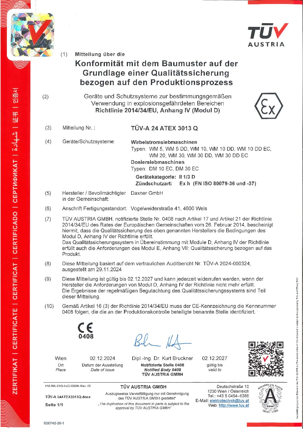 TÜV Austria gibt unsere Wirbelstrommaschinen und Dosiersiebmaschinen für die bestimmungsgemäße Verwendung in explosionsgefährdeten Bereichen frei.
