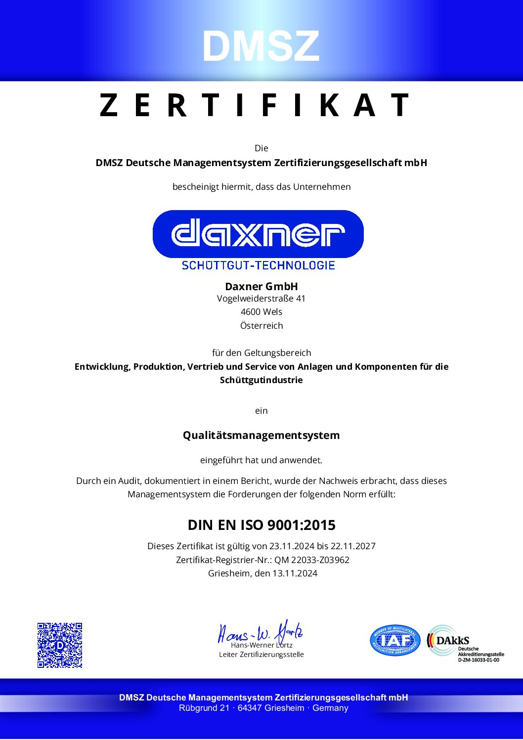 Das ISO-Audit prüfte Daxner zuletzt 2024 und bescheinigte unser implementiertes Qualitätsmanagementsystem in den Geltungsbereichen Entwicklung, Produktion, Vertrieb und Service von Anlagen und Komponenten für die Schüttgutindustrie für die nächsten drei Jahre.